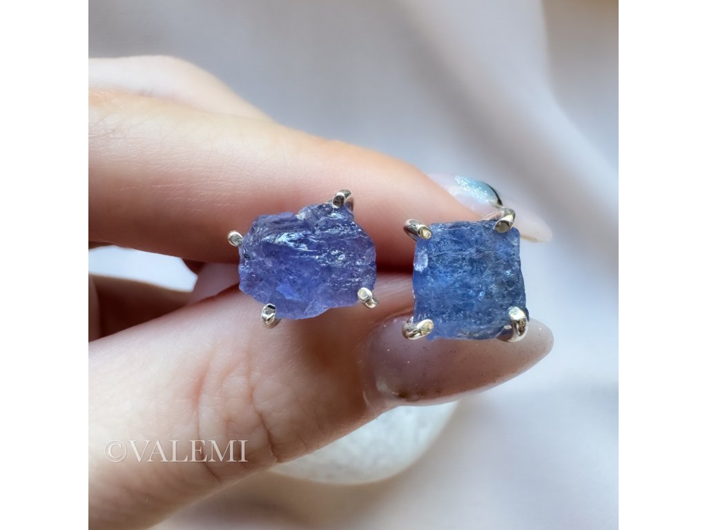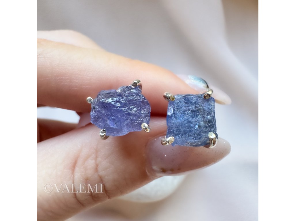 Surový tanzanit v těchto náušnicích si uchovává svou přírodní syrovost i sílu – podporuje soustředění, intuici a pomáhá při důležitých životních rozhodnutích. Je to kámen, který vás vede jemně, ale jistě.