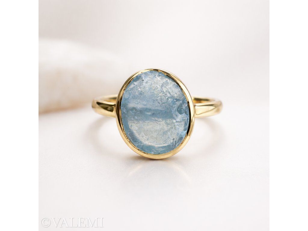 Surový akvamarín v organickém oválném tvaru nese energii jasnosti, odvahy a klidu, díky čemuž je každý kus jedinečným klenotem.