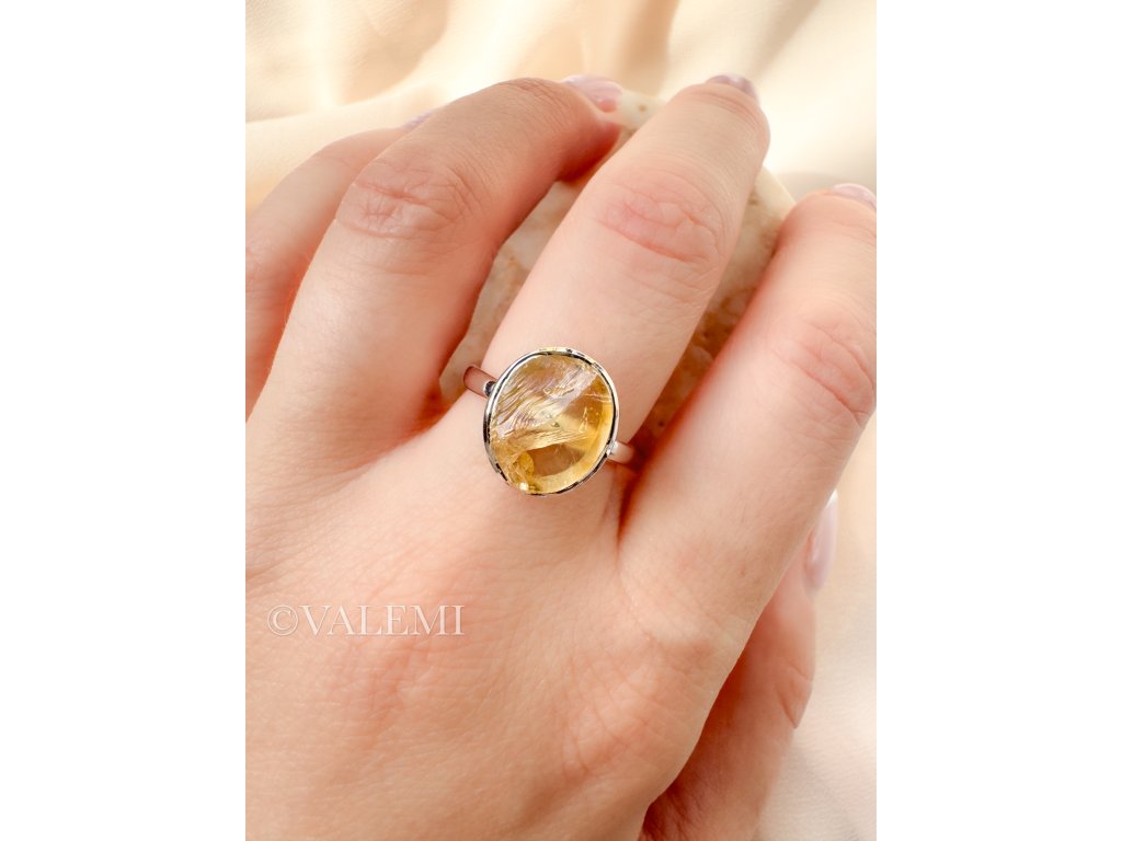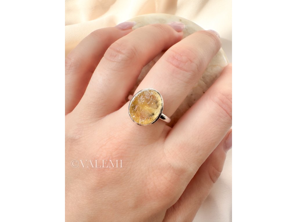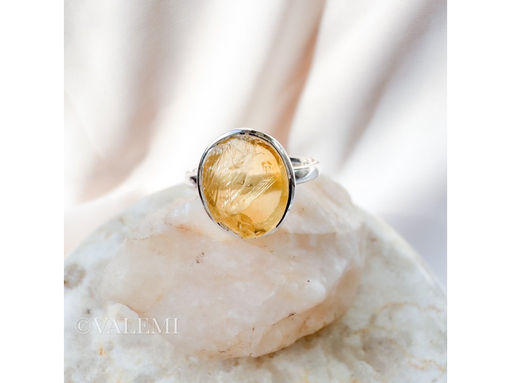 Tento prsten v sobě ukrývá citrín – kámen, který v sobě nese teplo slunce a energii nových začátků. Jeho zlatavé odstíny připomínají první paprsky svítání, kdy se svět probouzí k životu.